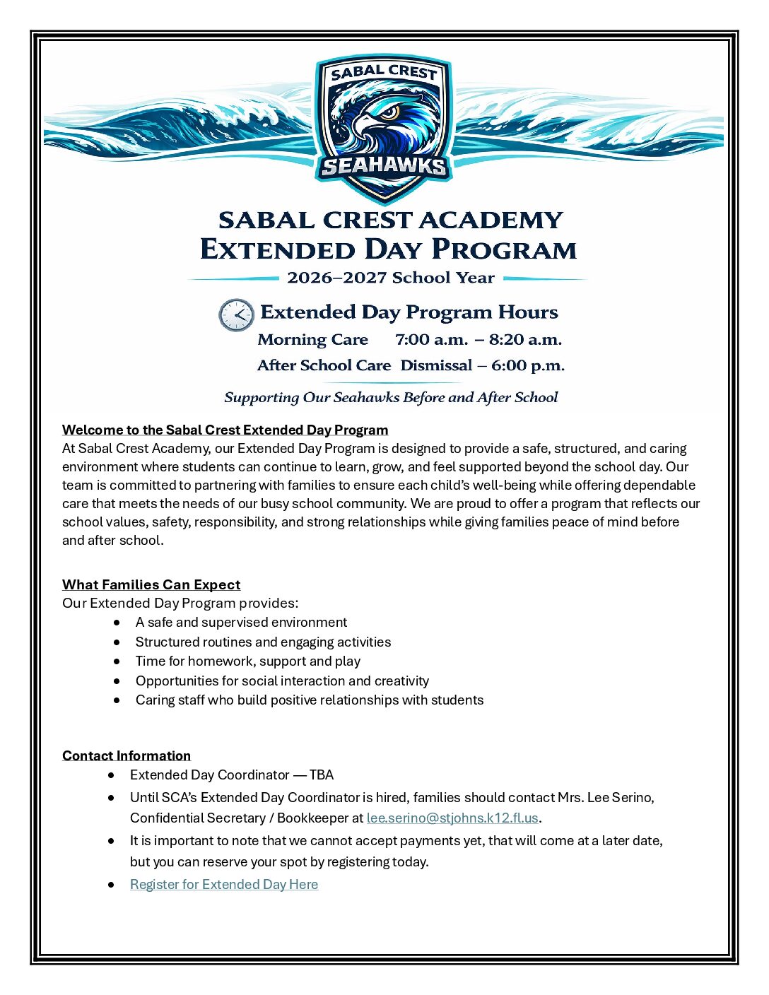 • Until SCA’s Extended Day Coordinator is hired, families should contact Mrs. Lee Serino, Confidential Secretary / Bookkeeper at [email protected].